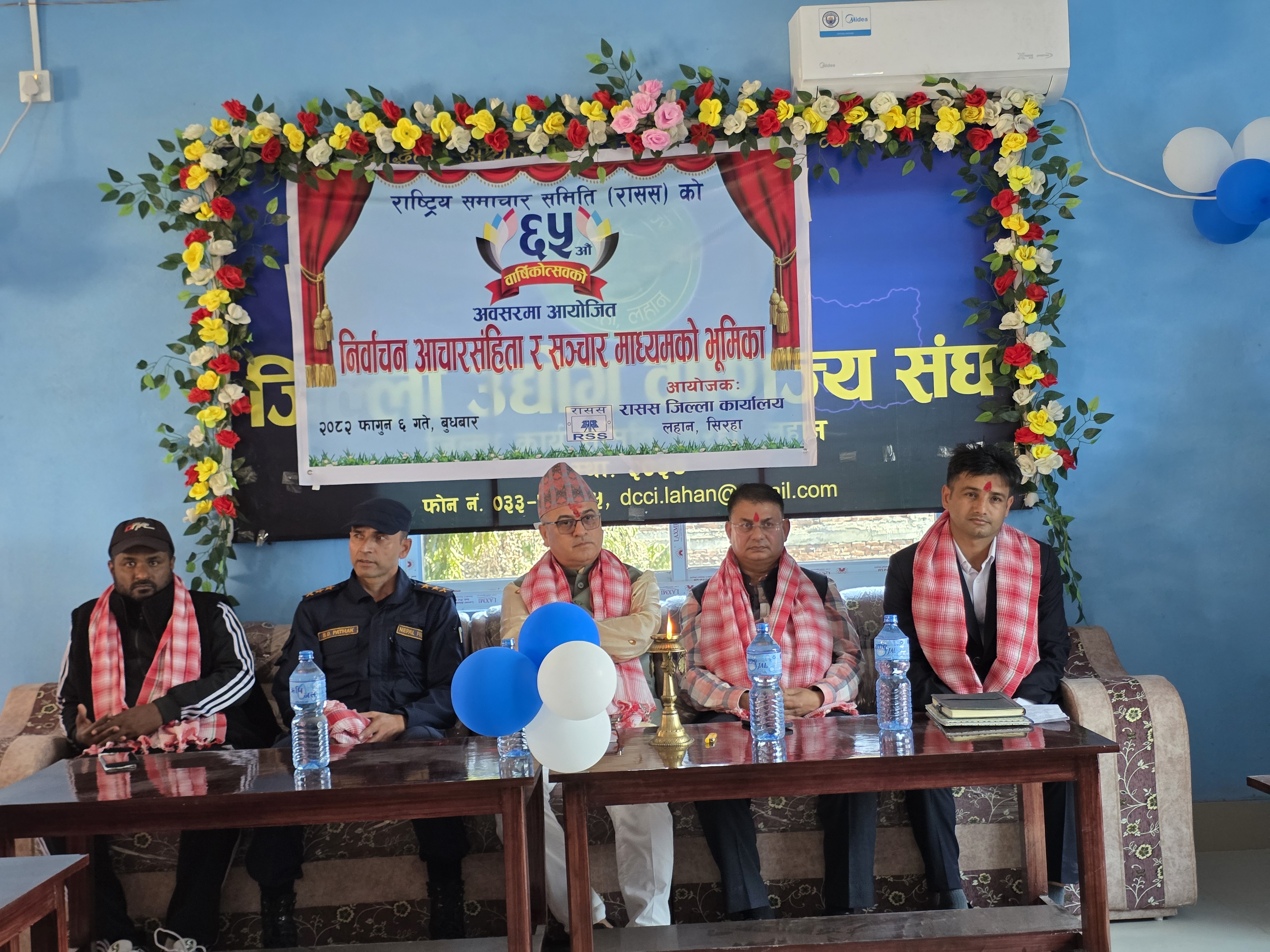 राष्ट्रिय समाचार समिति (रासस) को ६५औँ वार्षिकोत्सवका अवसरमा लहानस्थित जिल्ला कार्यालयले आयोजना गरेको “निर्वाचन आचारसंहिता र सञ्चारमाध्यमको भूमिका” विषयक अन्तरक्रियामा सहभागी वक्ताहरूले निष्पक्ष निर्वाचन केवल कानुनी प्रक्रिया नभई साझा जिम्मेवारी र व्यवहारिक अनुशासनको विषय भएको धारणा व्यक्त गरेका हुन् । उद्योग वाणिज्य संघ लहानको सभाहलमा सम्पन्न कार्यक्रममा निर्वाचन प्रशासन, सुरक्षा निकाय, सञ्चारकर्मी, निजी क्षेत्र र नागरिक समाजका प्रतिनिधिको उल्लेख्य सहभागिता थियो ।